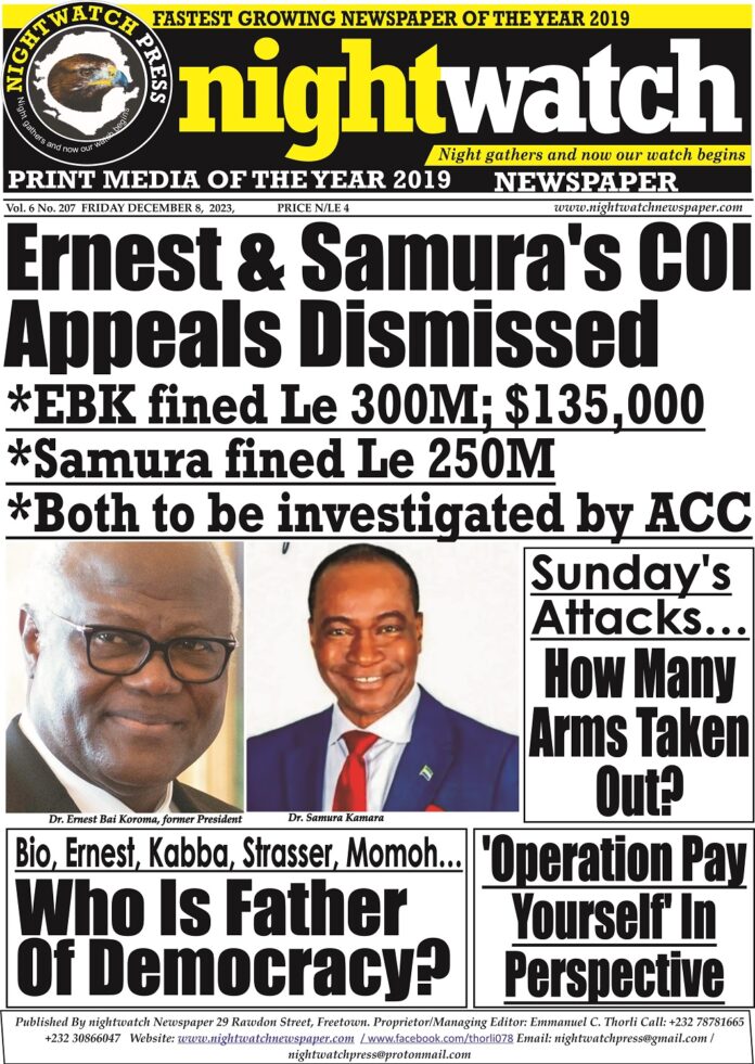 Ernest & Samura’s COI Appeals Dismissed *EBK fined Le 300M; $135,000 *Samura fined Le 250M *Both to be investigated by ACC