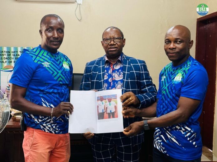 Aloyucsh Kamara, the medical doctor for the Sierra Leone Under-20 team, and Arnold Nakata Dennis Jackson, the team masseur, on Monday, 11th March, 2024, presented their comprehensive medical report to Harold Nat Johnson, Vice President 1 of the Sierra Leone Football Association.