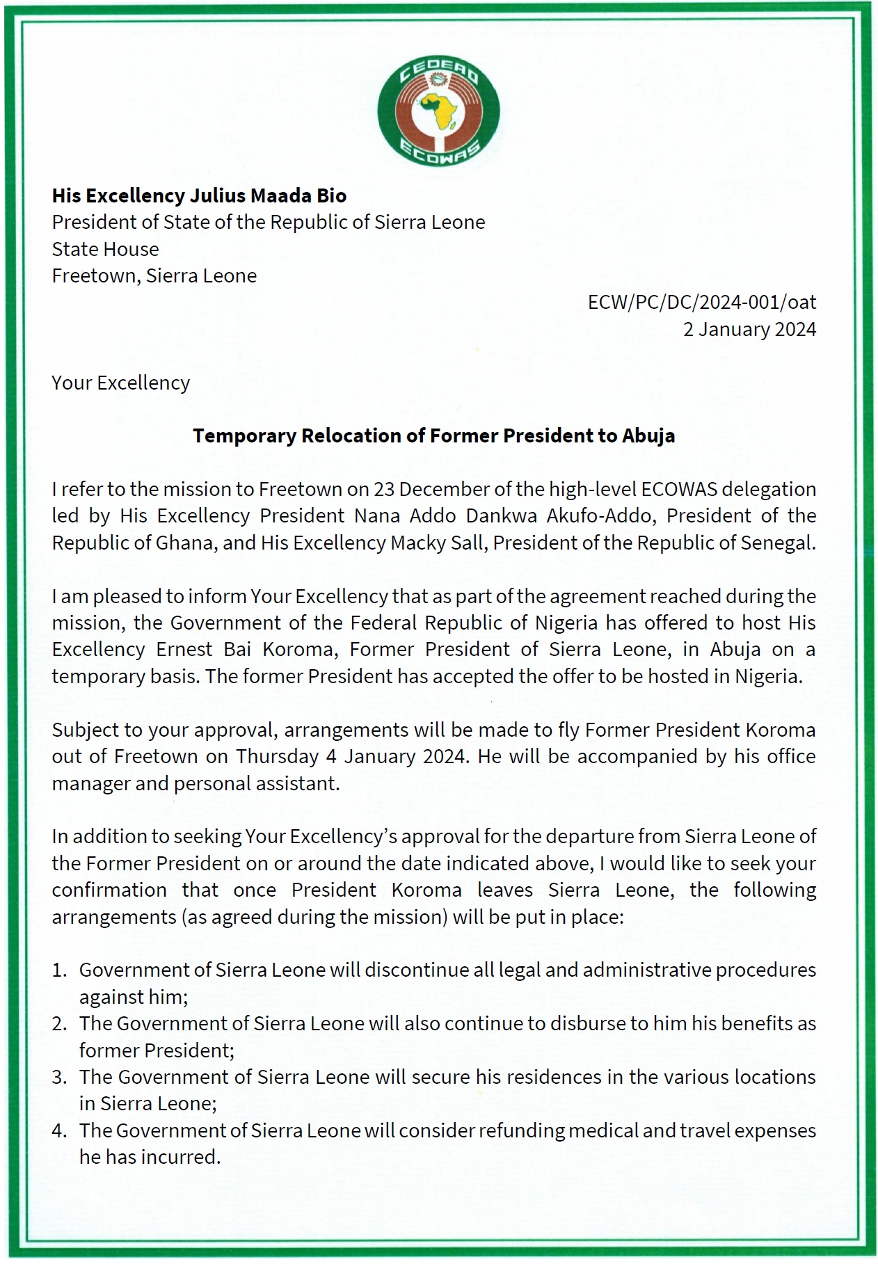 “I am pleased to inform your Excellency that as part of the agreement reached during the mission, the government of the Republic of Nigeria has offered to host His Excellency Ernest Bai Koroma, former President of Sierra Leone, in Abuja on temporary basis,” an ECOWAS letter reads in part.