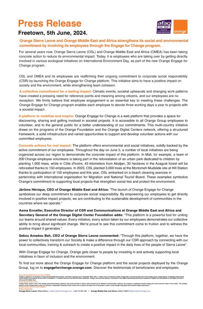 Breaking NewsFeatureTechnology Orang Sierra Leone And Orange Middle East And Africa Strengthens its Social And Environmental Commitment By Involving Its Employees Through For Change Program By Emmanuel Christian Thorli - June 5, 2024 0 457 FacebookTwitterPinterestWhatsApp
