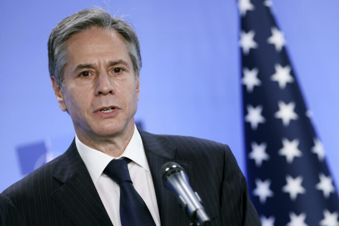 United States Secretary of State Antony Blinken speaks during a media conference at NATO headquarters in Brussels, Wednesday, April 14, 2021. (Kenzo Tribouillard, Pool via AP)